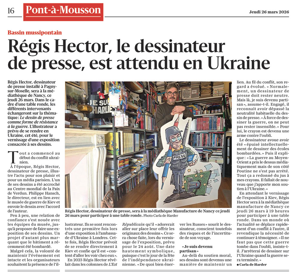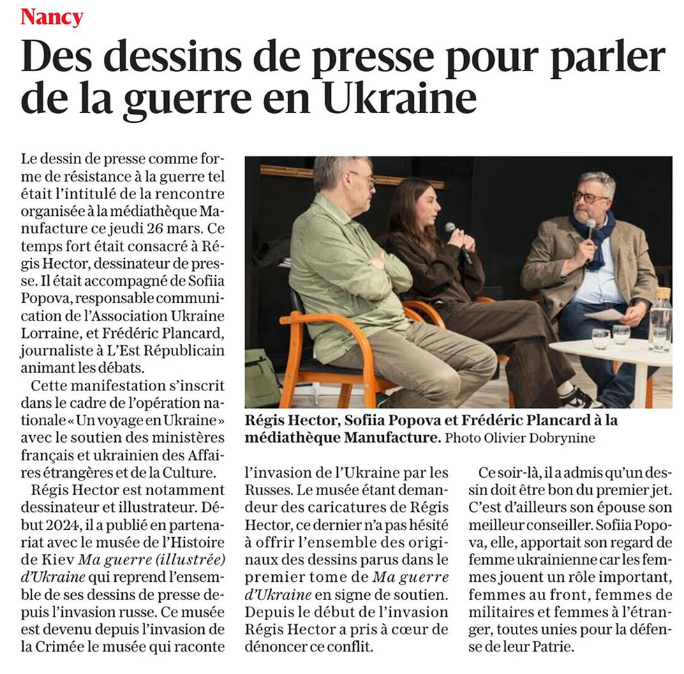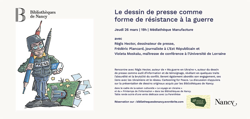 Sensible à mon travail sur le conflit ukrainien et mon soutien à la résistance, les Bibliothèques de Nancy organise une table ronde avec le public sur le thème "Le dessin de presse comme forme de résistance à la guerre". Cette manifestation s'inscrit dans le cadre de l'opération nationale "Un voyage en Ukraine" initié par l'Institut français et l'Institut Ukrainien avec le soutien des ministères français et ukrainien des Affaires étrangères et de la Culture.
