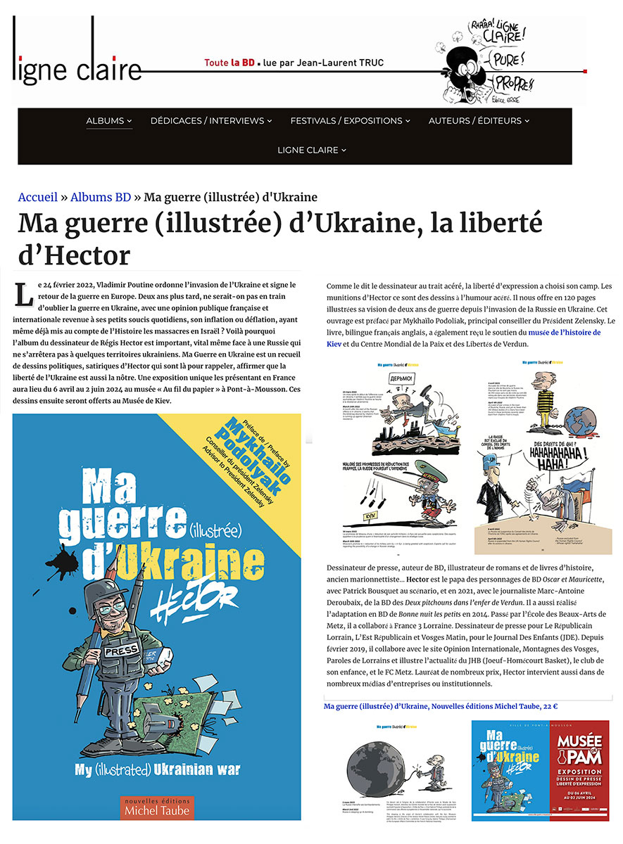 Jean-Laurent Truc, journaliste BD, s'est fait l'écho sur son site LigneClaire de mon nouvel album de dessins de presse "Ma guerre (illustrée) d'Ukraine paru aux éditions Michel Taube.